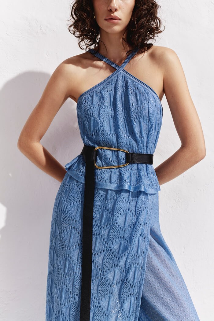 Outro destaque está no decote halter com alças cruzadas, que valoriza os ombros e o colo, trazendo ainda mais leveza ao look. Seja para um brunch elegante, um almoço à beira-mar ou uma sunset party cheia de charme, esta é a peça que vai transformar qualquer momento.