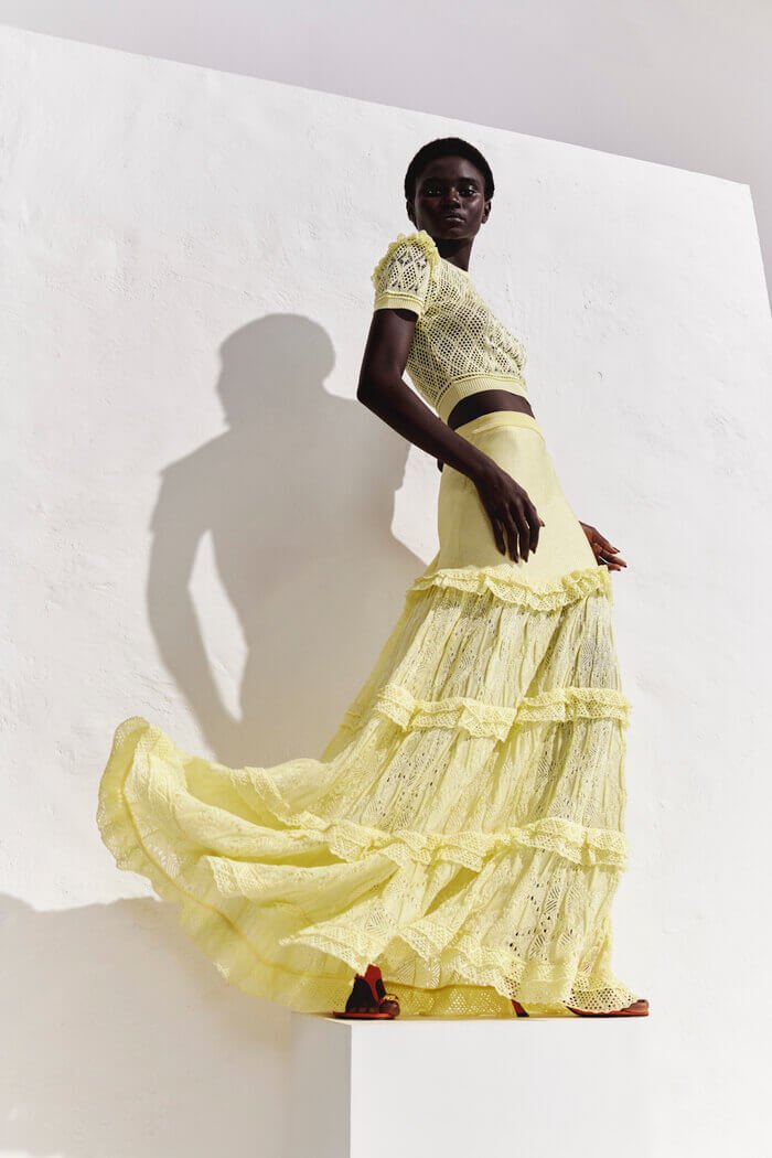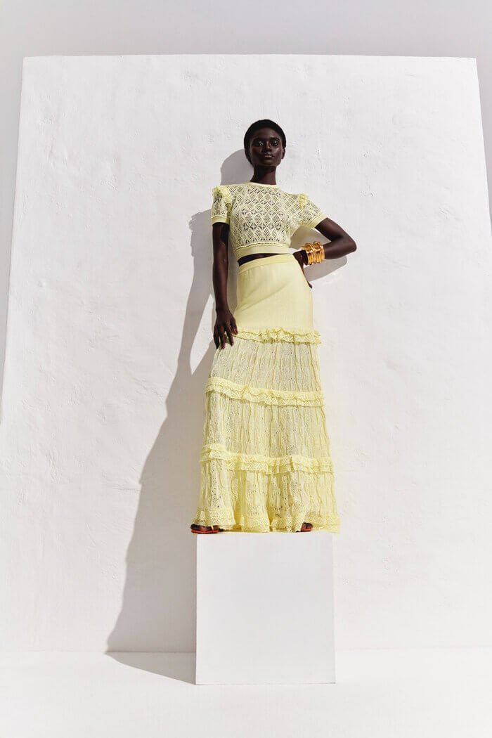 Textura artesanal em tricot rendado, caimento fluido e babados que criam movimento. Além disso, o design boho chic e o toque leve transformam a peça em um essencial sofisticado para o verão Paradiso.