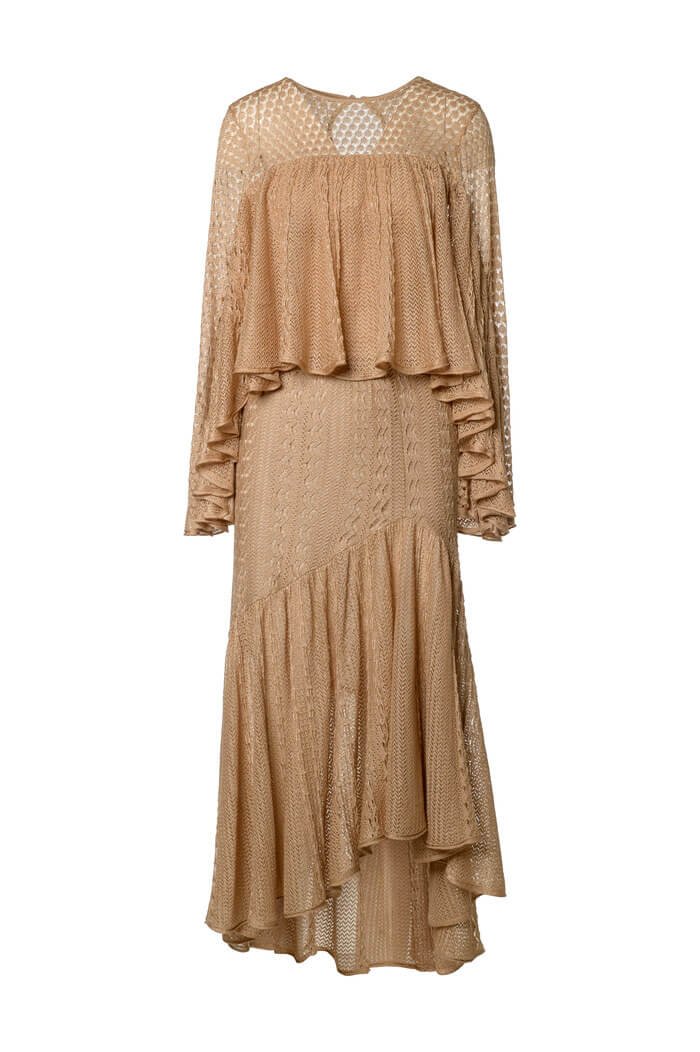 Textura rendada artesanal com transparência delicada. Além disso, a modelagem fluida cria movimento elegante, enquanto o cós ajustado realça a silhueta com naturalidade.