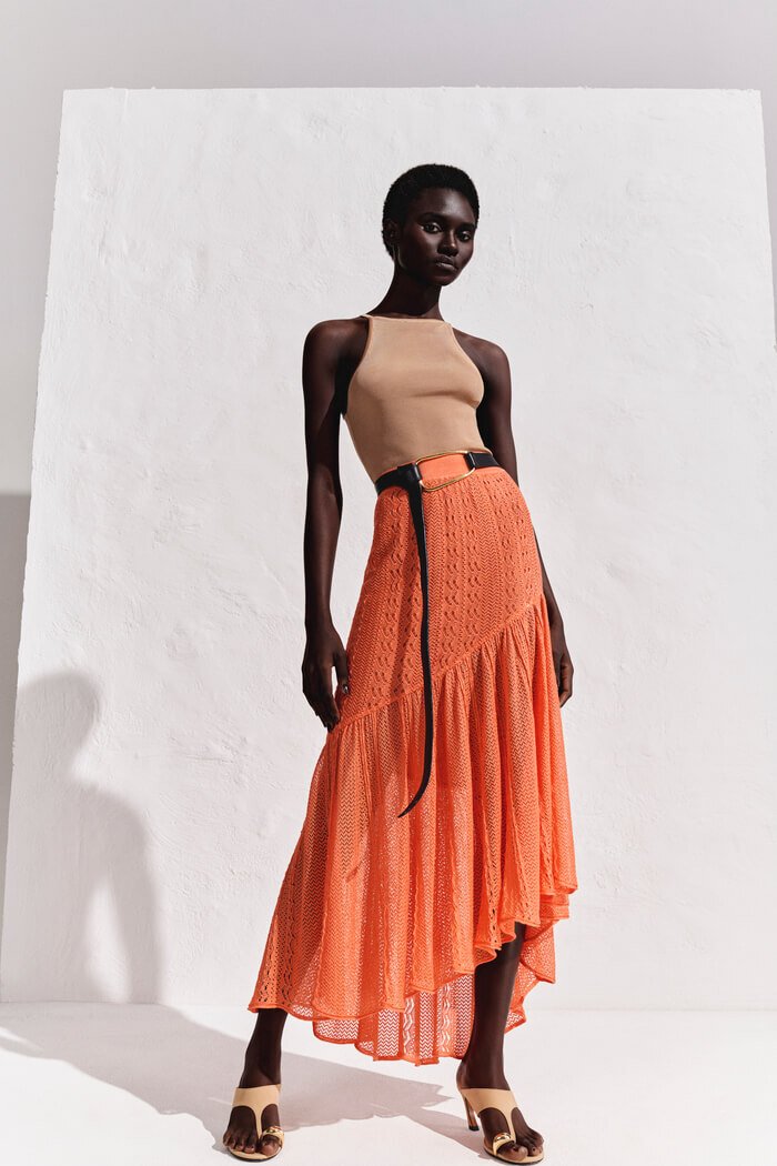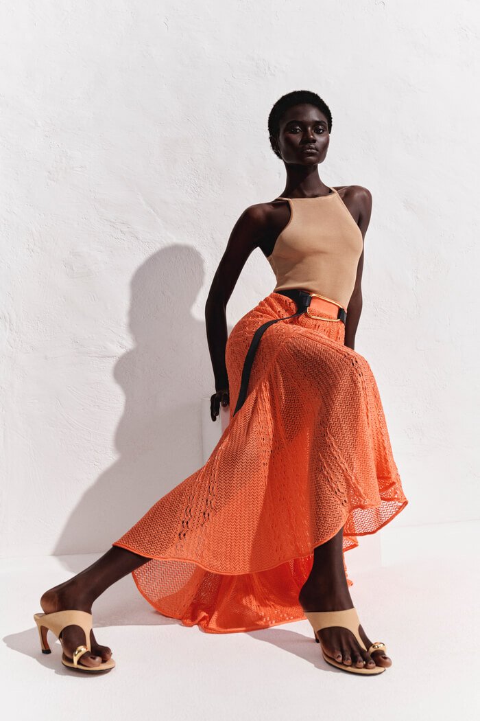 Por fim, o tom coral intenso ilumina a silhueta e traduz a essência solar da coleção Paradiso: elegante, livre e vibrante.