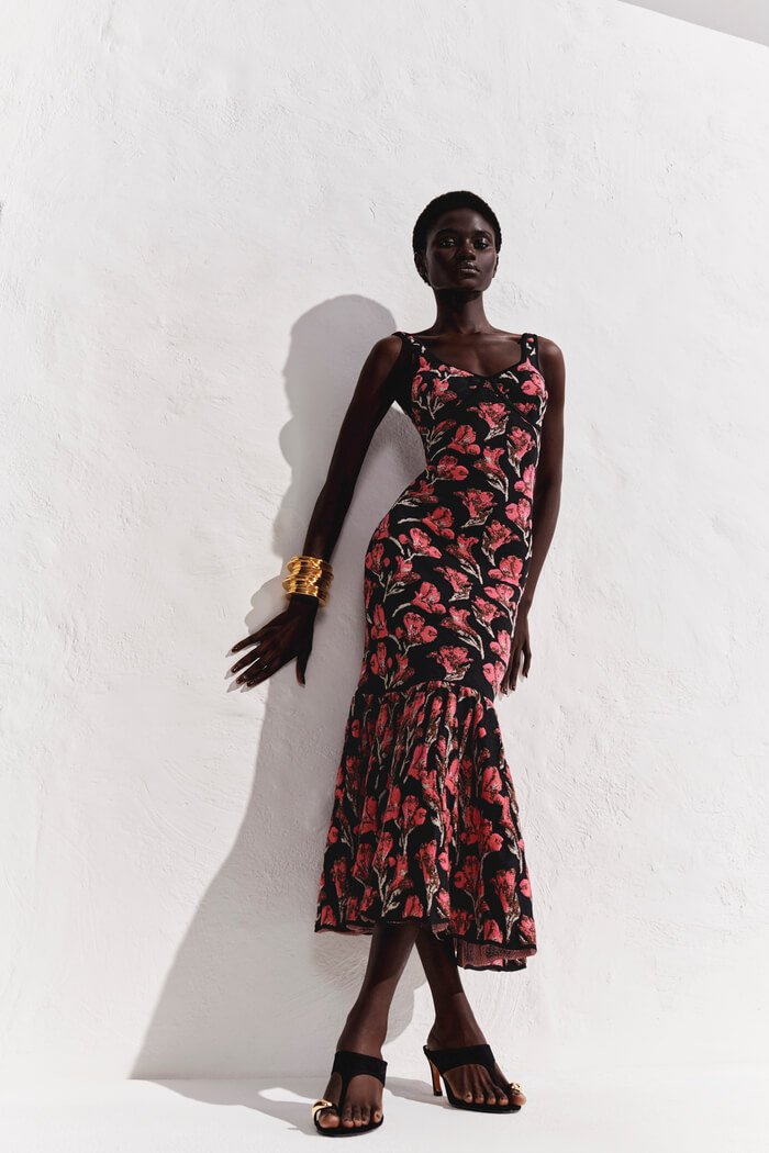 Mesmo sendo marcante, ele é versátil. Por exemplo, use com sandálias delicadas para um ar romântico ou com saltos poderosos para criar presença. Da mesma forma, acessórios metálicos realçam ainda mais o brilho sutil do jacquard.