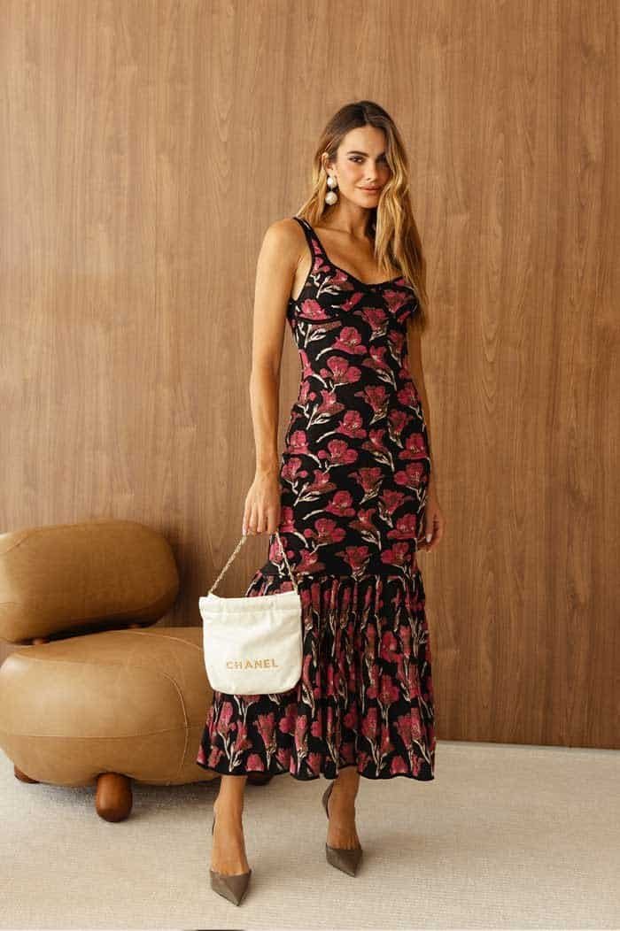 Por outro lado, o recorte da saia amplia o movimento, o que proporciona uma fluidez encantadora a cada passo. Assim, esse vestido transita facilmente do entardecer ao jantar com charme absoluto.
