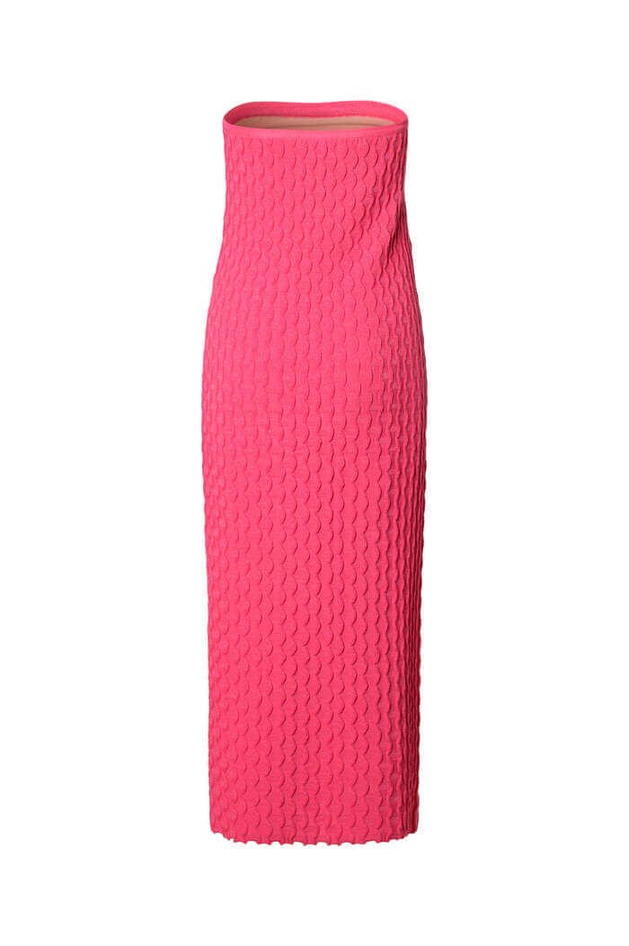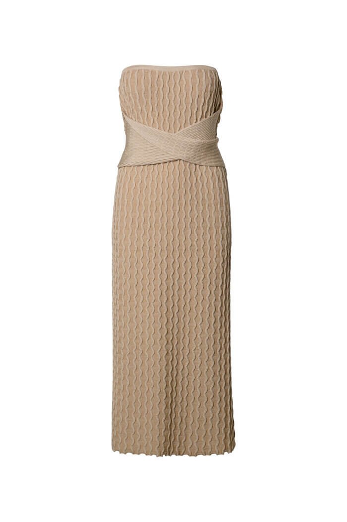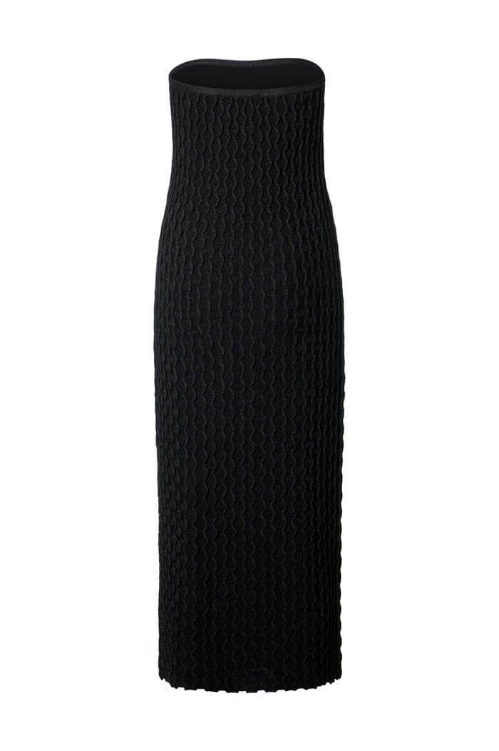 Confeccionado em galga fina com fio rayon lycra, o vestido garante caimento impecável e memória no tecido, mantendo a forma mesmo após o uso. O design sem alças realça os ombros e o colo, perfeito para quem busca um visual refinado e feminino.