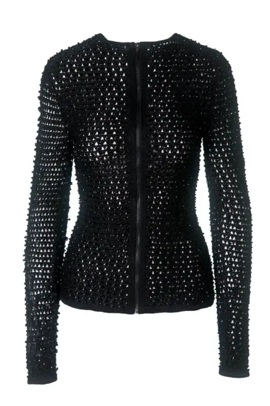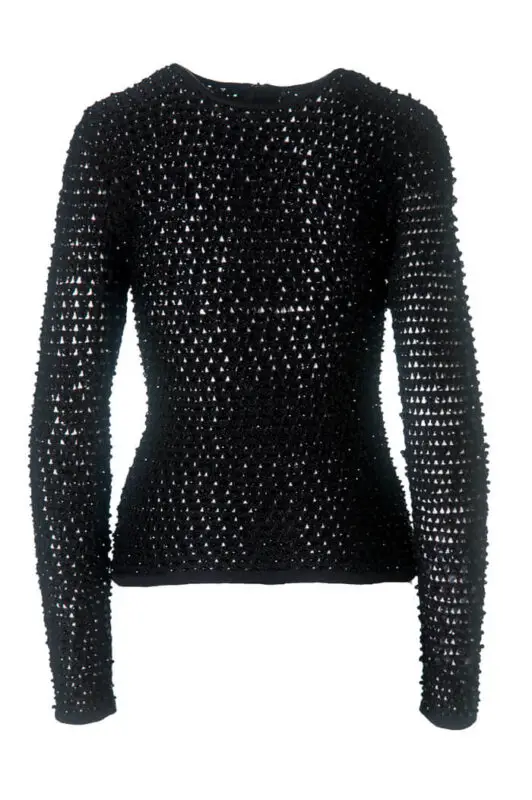 Tecelagem telada em galga fina , trazendo ao tricot toda a sutileza e sofisticação, com aplicação de micro cristais em toda a superfície, ela alia impacto visual e elegância com maestria.